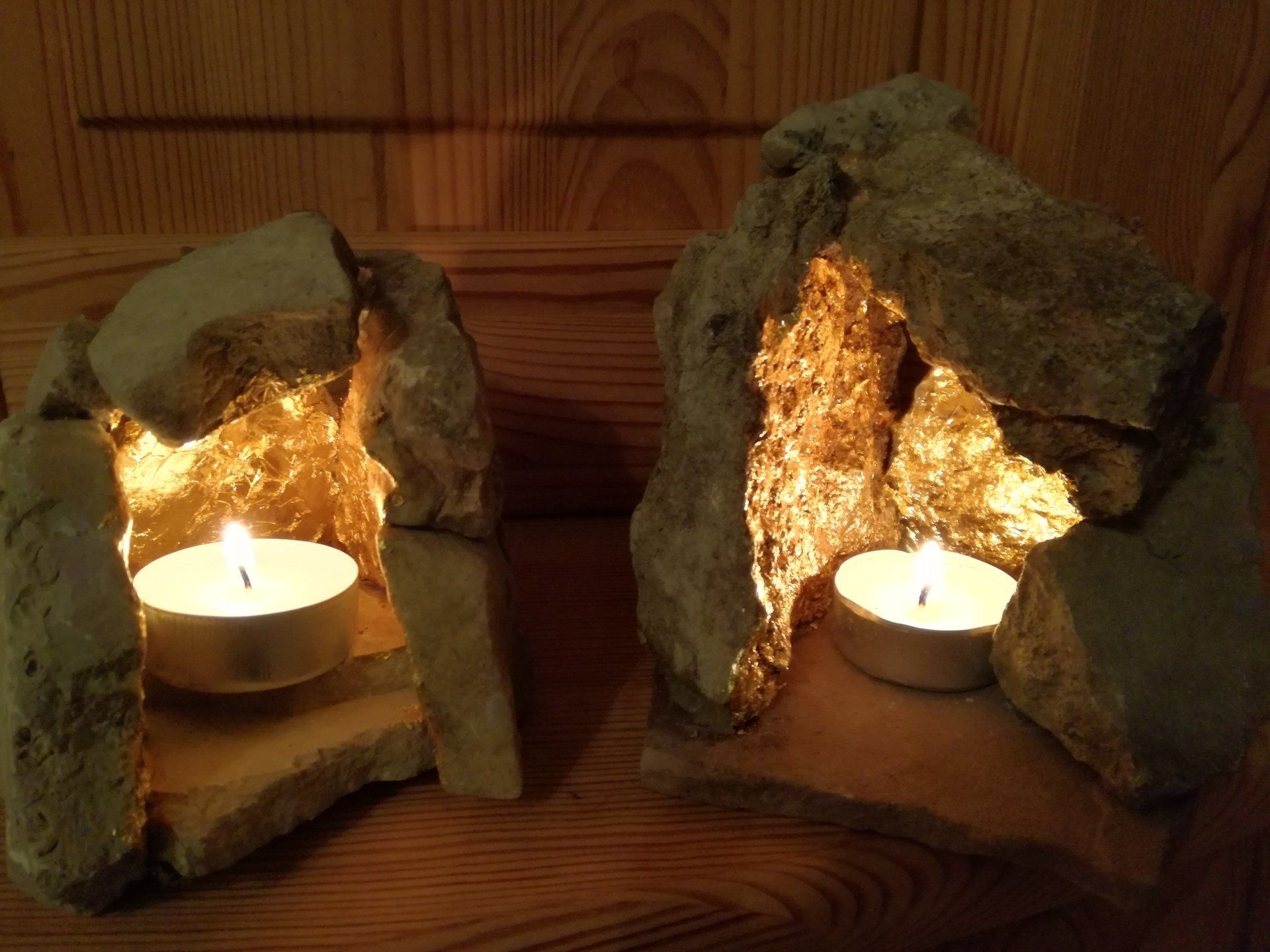 Steinhöhle mit echtem Blattgold, Teelicht und Text, verschiedene Größen: 14,99€ -39,99€, jede ein Unikat